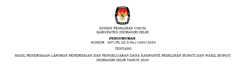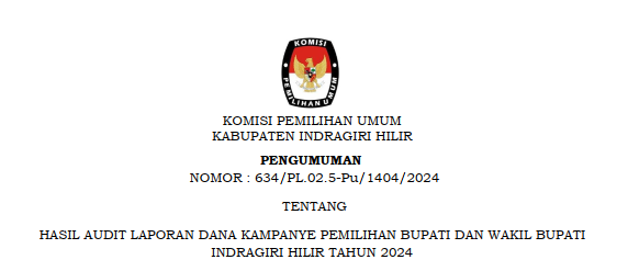 Pengumuman Rekapitulasi Hasil Penghitungan Perolehan Suara dan Penetapan Hasil Pemilihan Gubernur dan Wakil Gubernur serta Bupati dan Wakil Bupati Tingkat Kabupaten Indragiri Hilir Tahun 2024
