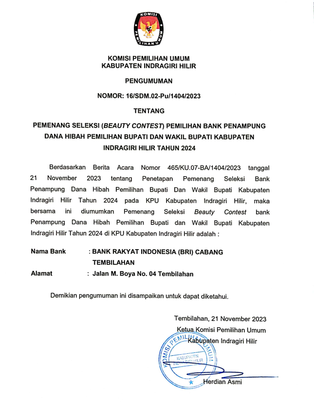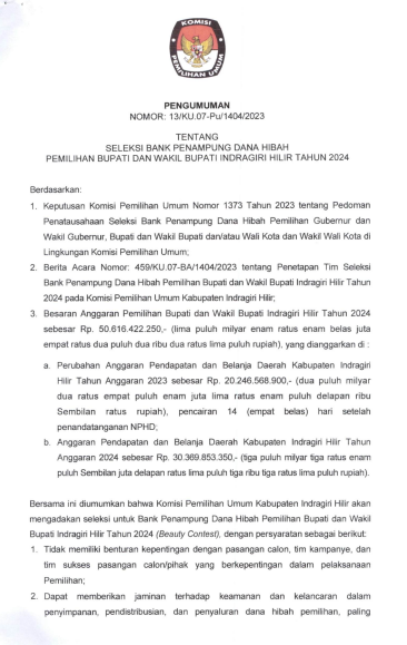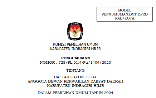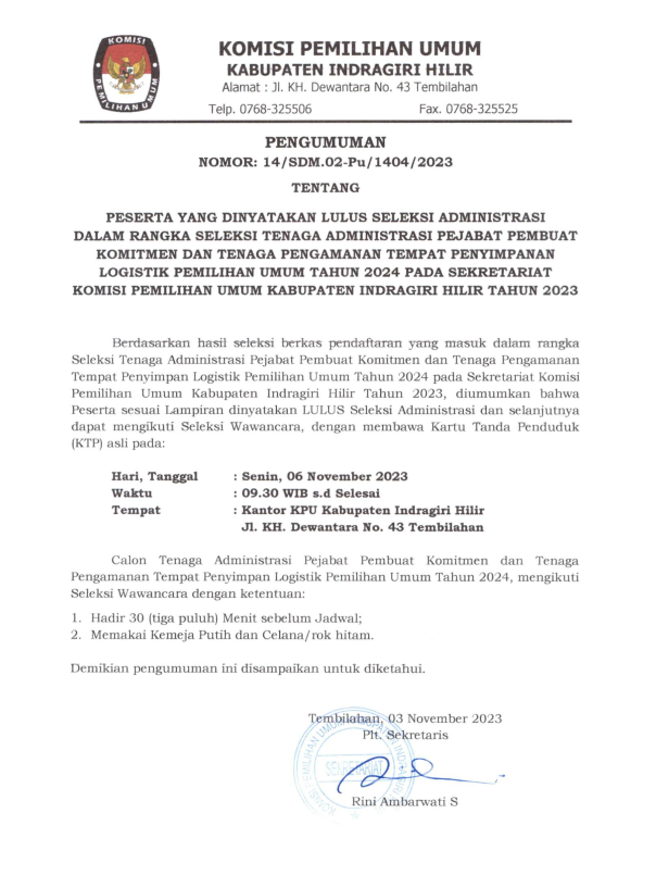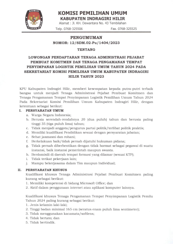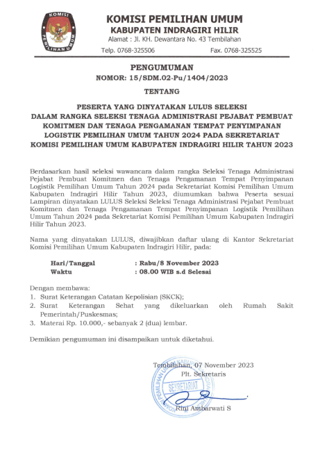 Pengumuman Tentang Peserta yang Dinyatakan Lulus Seleksi Administrasi dalam Rangka Seleksi Tenaga Administrasi Pejabat Pembuat Komitmen dan Tenaga Pengamanan Tempat Penyimpanan Logistik Pemilihan Umum Tahun 2024 pada Sekretariat Komisi Pemilihan Umum Kabupaten Indragiri Hilir Tahun 2023 KLIK DISINI !